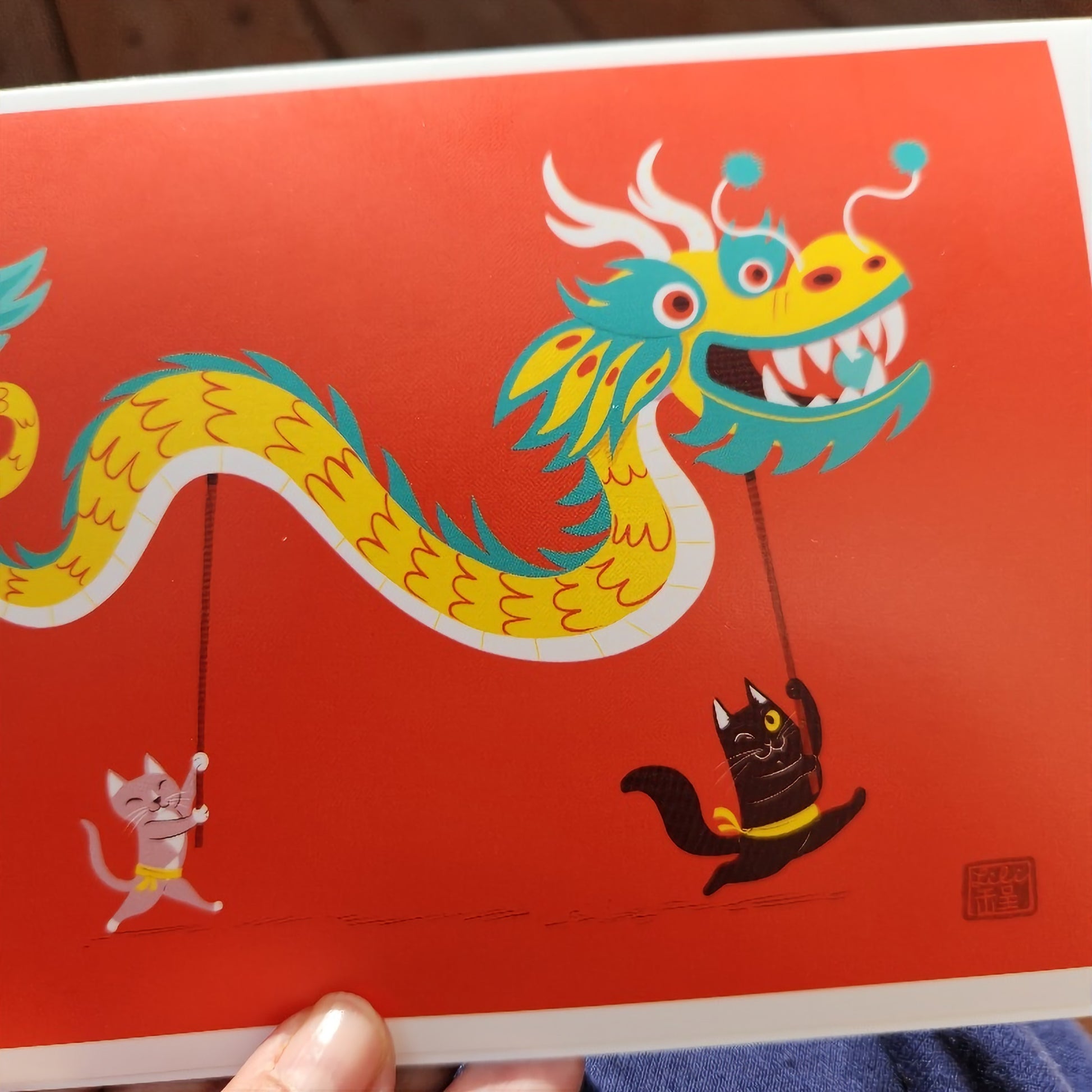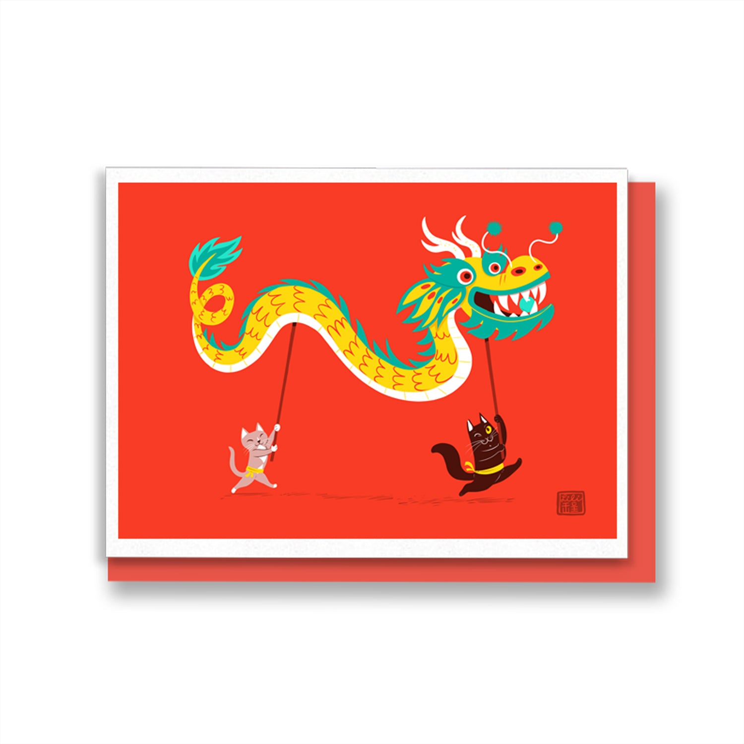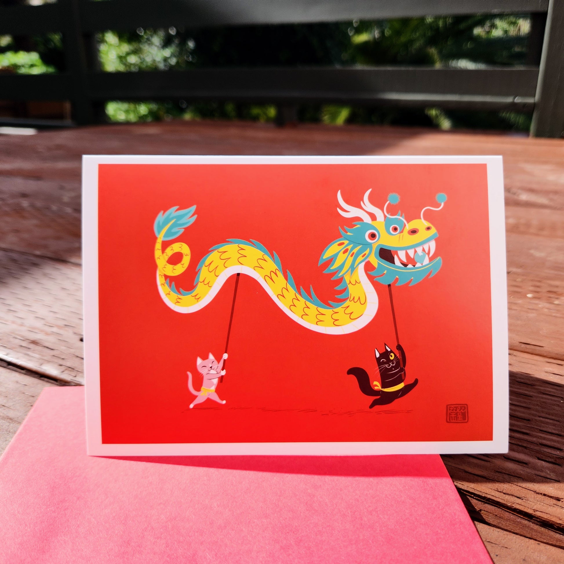 2024 YEAR OF THE DRAGON greeting card! Starring my two cats, Mambo and Shimmy, doing a dragon dance.
