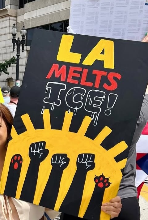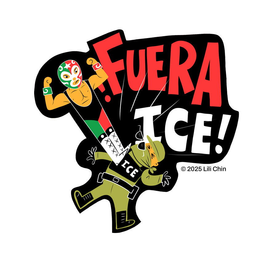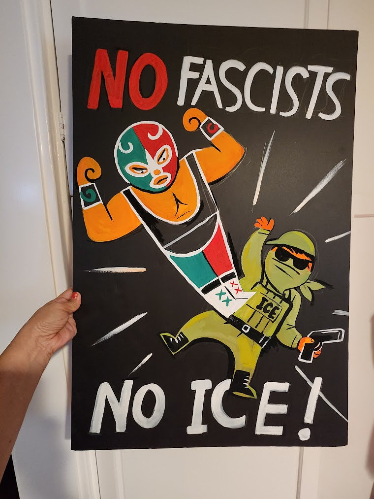 My drawing of a luchador drop-kicking a US gestapo agent first took form as a hand-painted sign to protest the illegal raids and kidnappings in my SoCal neighborhood and all around the country that are brazenly racist.