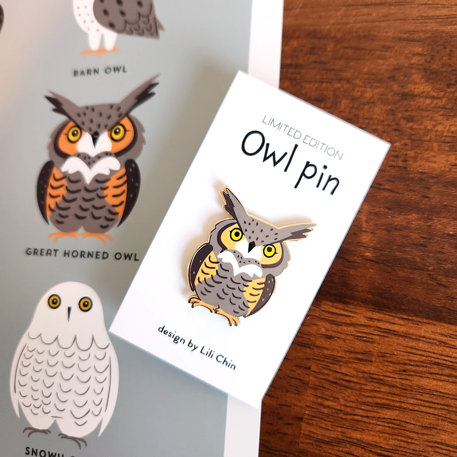 A beautiful limited edition pin produced by Sunrise Tornado Game Studio, in conjunction with FORK board game. The owl design is from my Owls print.