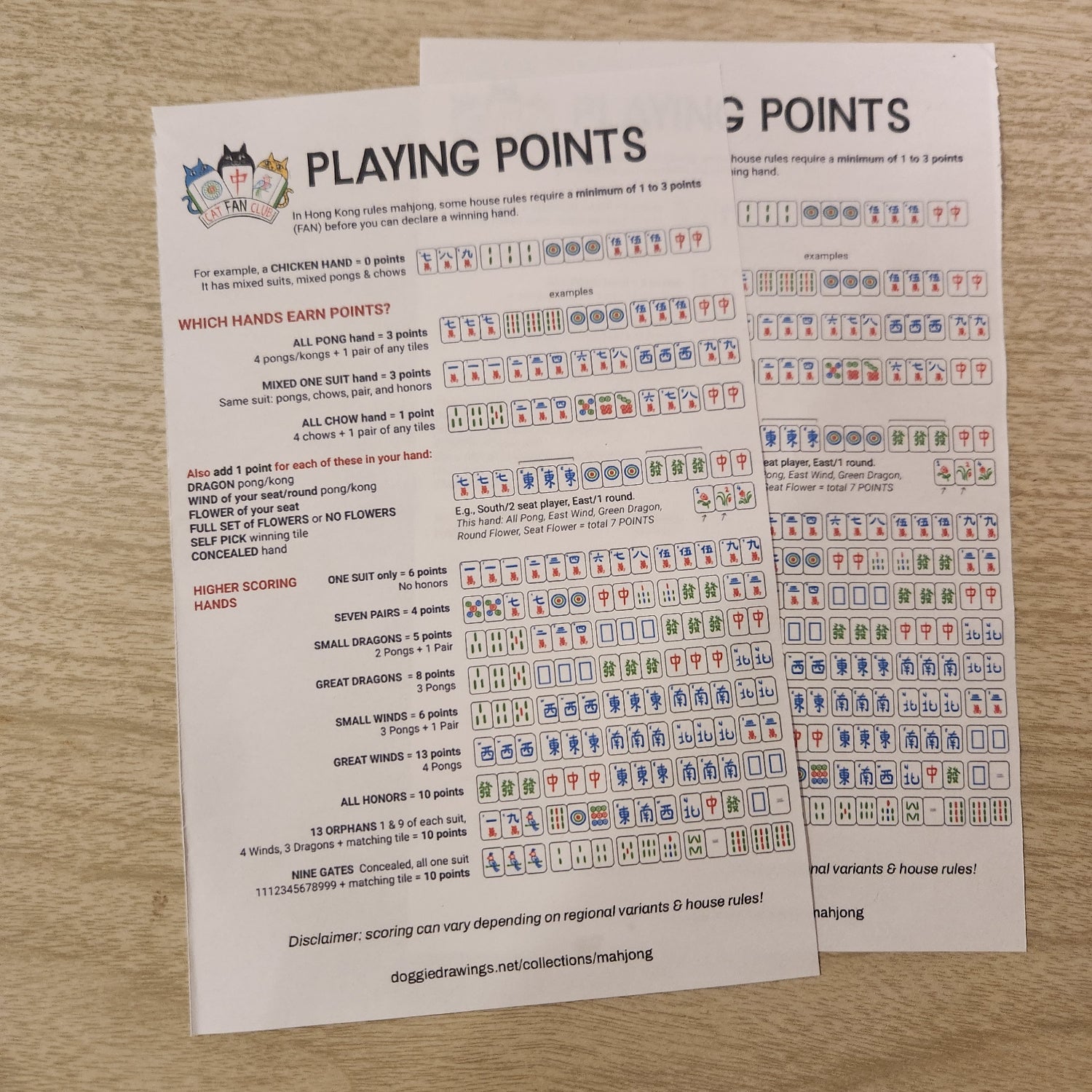 Note that there are many regional variants of Mahjong rules, as well as house rules. The rules and scoring in this little guide is just how we play, as taught to us by our friends. Feel free to edit and modify to suit your group!