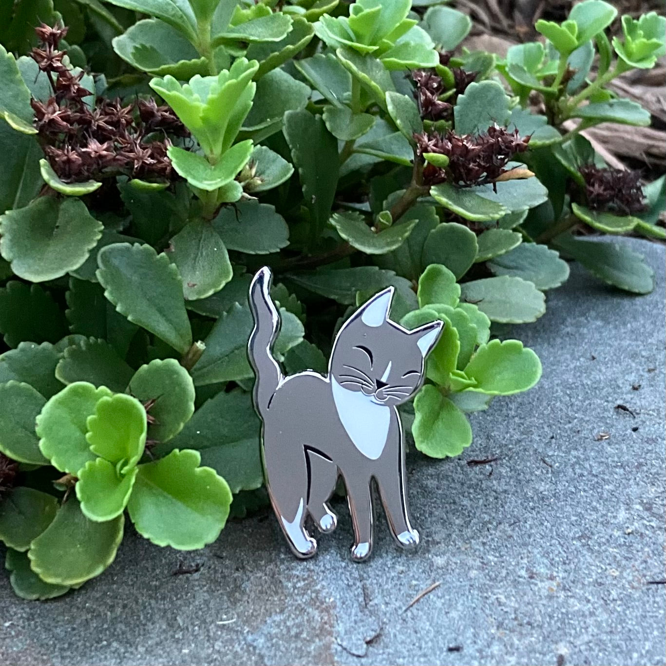 This large pin is inspired by my petite gray and white tuxedo cat, Shimmy, when she is a purring, tail-quivering kitty, rubbing her head on furniture or asking for scritches.