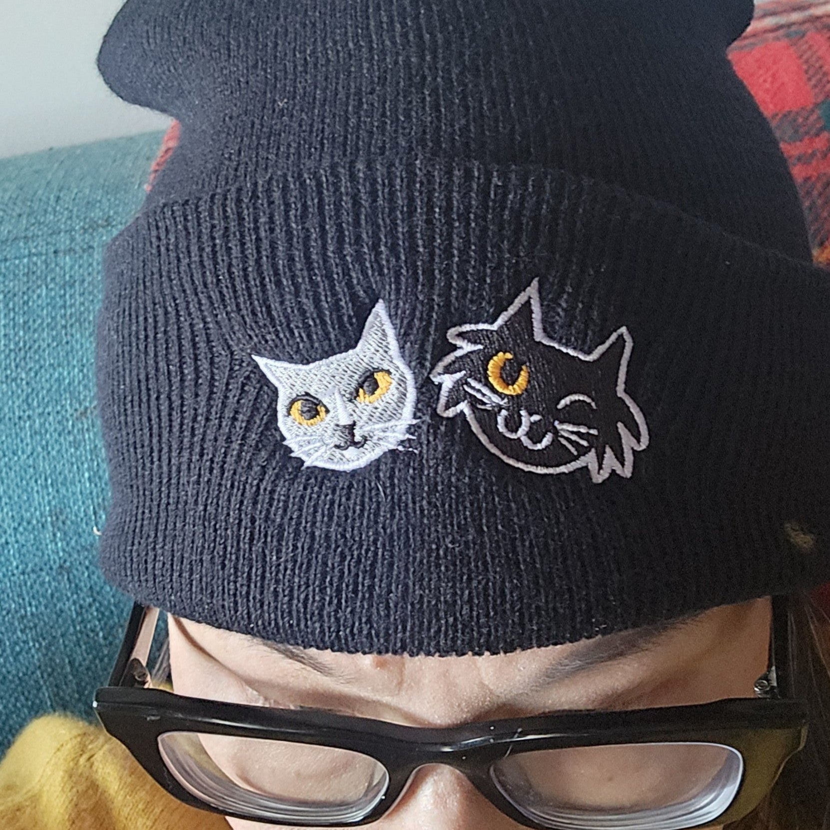 A knitted beanie featuring an embroidered image of my cats, Mambo and Shimmy!